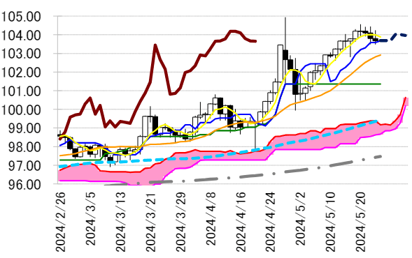 は本日 103.69 円で推移。上昇傾向の同線は支えにるとみる。