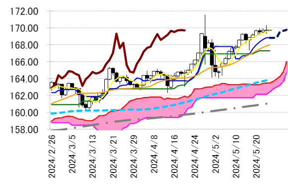 上昇傾向を維持しそうな一目・転換線 168.83 円は、やや押