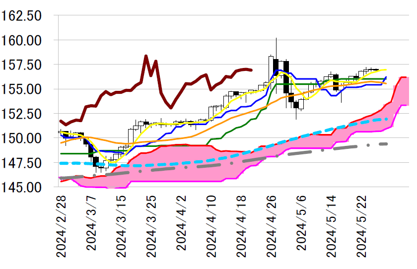 本邦通貨当局は、4月29日に2回(159円付近と157円付近)、5月2日早朝に157円付近でドル売り・ 円買い介入を実施したと見なされている。