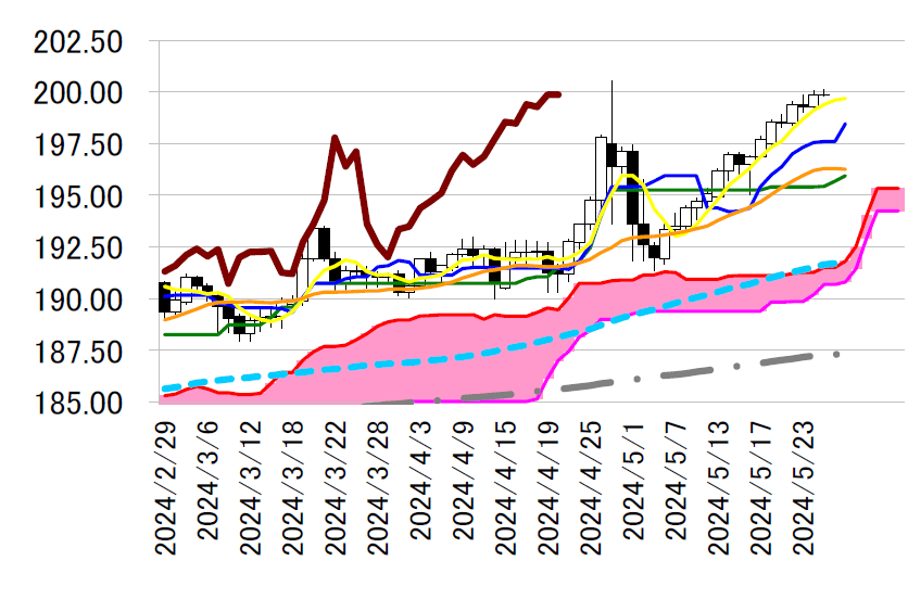 小陽線引け。転換線は基準線を下回っているものの、遅行