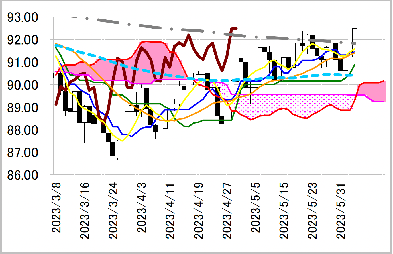 大陽線引け。相場の強弱を判断する際の分岐点とされる200 日移動平均線を上抜けて上伸した。5 月2 日の上振れでつけた高値92.44 円を上回る強い動き。気掛かりなのは200日線がまだ低下中で、調整局面において下支えになりそうな主だった日足テクニカル指標が見当たらないこと。高値圏で不安定に振れる局面がありそうだ。
