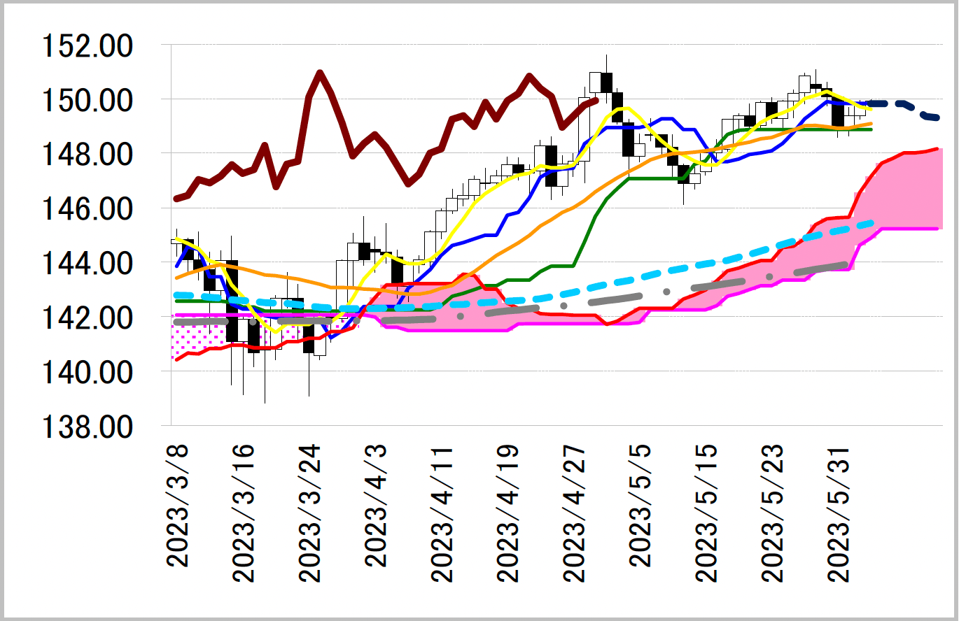 下影陽線引け。1 日に一目均衡表・基準線148.87 円を下回った水準から浮上し、先週末は一目均衡表・転換線149.83円を一時上回った。転換線を下回って週引けとなったものの、週明けは再び同線を上回る推移となった。ただ、同線は現水準で頭打ちとなる可能性がある。やや重い動きとなり、149円付近で推移する21 日移動平均線や、転換線付近まで下押す場面も想定しておきたい。