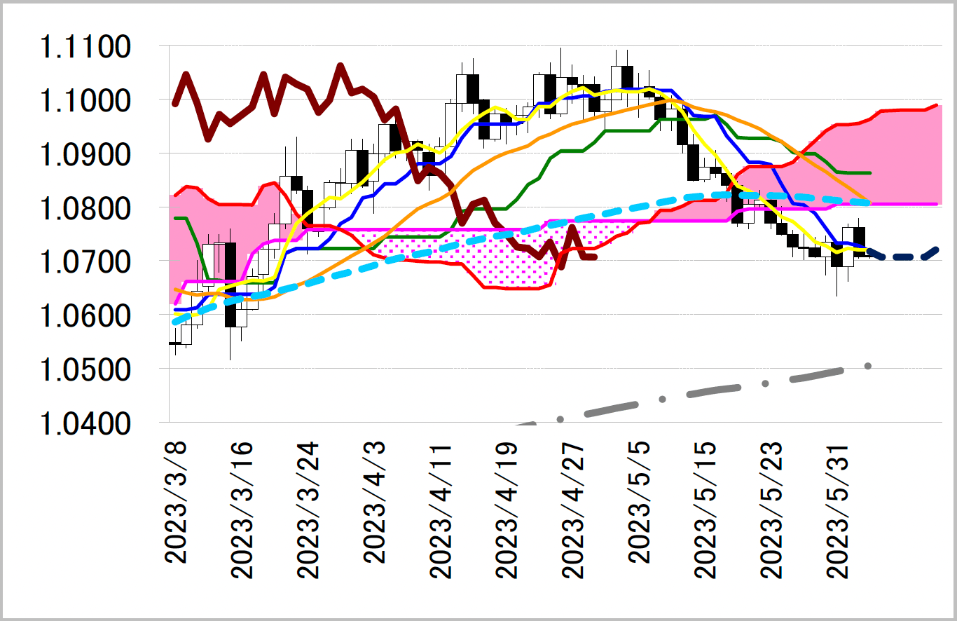 近へ押し返されて週の取引を終えた。1.07ドル台で低下傾向の一目均衡表・転換線を追うような格好となったが、同線は明日1.0707 ドルまで低下したところで底打ちすることが見込まれる。同線の底打ちから戻りに沿って、相場水準が回復するか注視する局面となる。