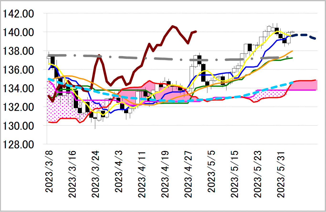 大陽線引け。一目均衡表・転換線を下回る水準で下げ渋り、140円台に乗せる上昇となった。上昇傾向の転換線前後での底堅い動きがしばらく続くか。ただ、同線は現状からすれば明日139.69円へ上昇したところで頭打ちとなる公算。転換線の頭打ちとともに相場が失速する展開を回避するためにも年初来高値を更新して直近のレンジ上限を切り上げる必要がある。