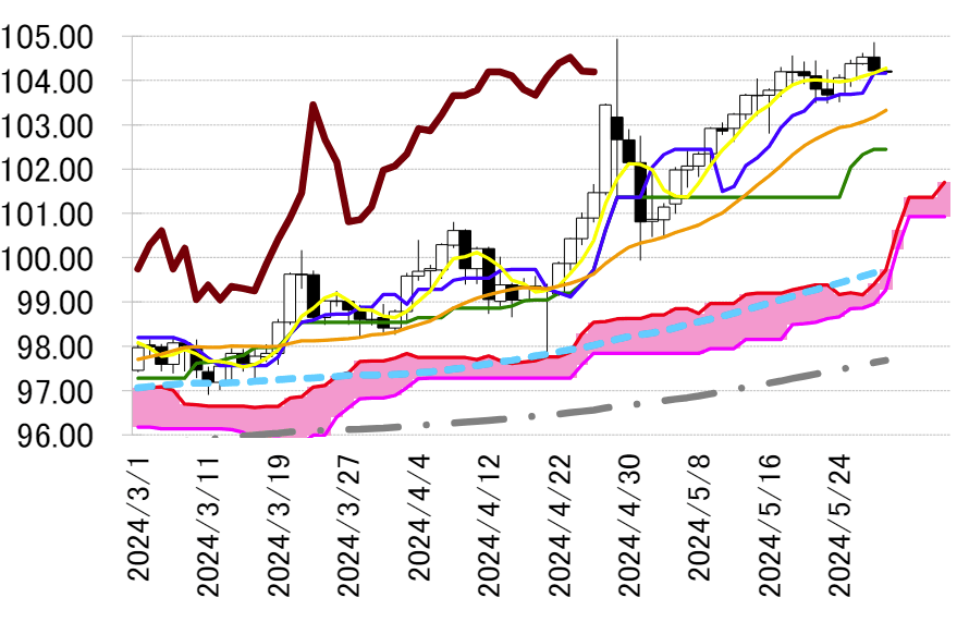 たものの、依然として転換線 104.17 円を上回って引けてお