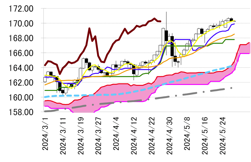 て転換線 169.90 円を上回って引けており反発の可能性が示