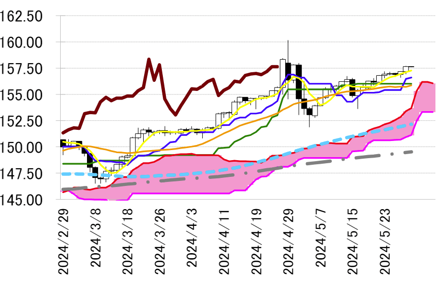 ドル円の 157 円台は、4 月 29 日の 159 円台の第 1 弾介入に続く第 2 弾介入、そして 5 月 2 日未明の第 3 弾介入という防衛ラインだと思われることで、本日も警戒しておきたい。