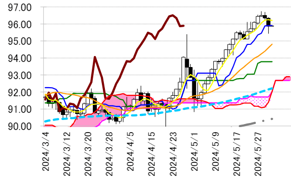 グナルが点灯している。しかし、2 手連続陰線で転換線 95.91