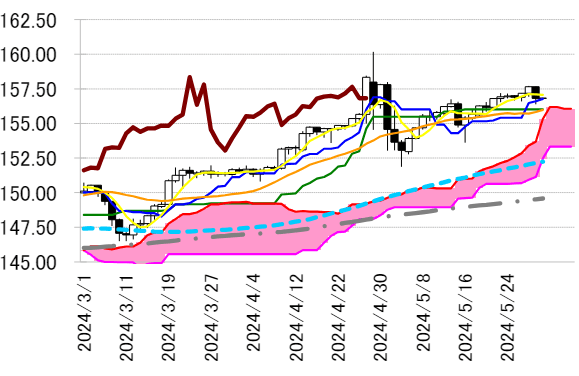 本日は転換線 156.78 円を念頭に置き、基準線を支持に押