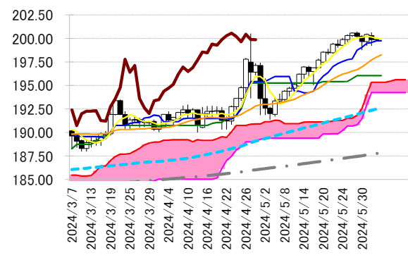 本日は転換線 199.75 円を念頭に置き、3 日の安値を支持に