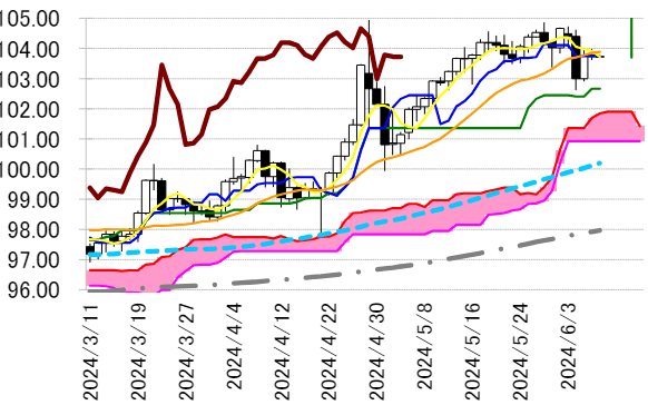 シグナルが点灯中。しかし、孕み線で反落して転換線 103.74