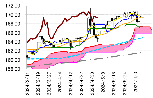 本日は転換線 169.49 円を念頭に置き、6 日の高値を抵抗に