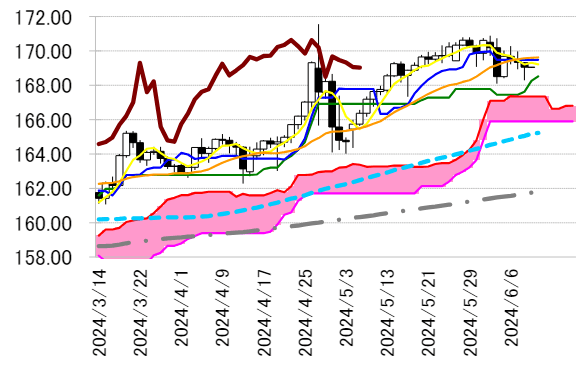 本日は転換線 169.49 円を念頭に置き、6 日の高値を抵抗に