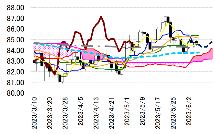 小陰線引け。低下傾向の一目均衡表・転換線 84.50 円付近でさえない推移が続いている。同線の動きが示唆するように、83.70 円台に位置する 90 日移動平均線や一目・雲の上限83.49 円をめどに下値を探るリスクが警戒される。ただ、上昇する雲の上限が支えとなるほか、84.31 円での底打ちが予想される転換線の動きは下げ渋りの示唆と受け止めることができる。