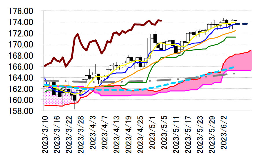下影陽線引け。173 円台で上昇中の一目均衡表・転換線付近で底堅い推移を継続している。一時 172.67 円へ下振れつつも 174 円台を回復。同大台を維持して NY を引けている。転換線は本日 173.61 円へ切り上がった。下支えとなるテクニカル指標の上昇を支援に高値更新を試す展開が続くか。