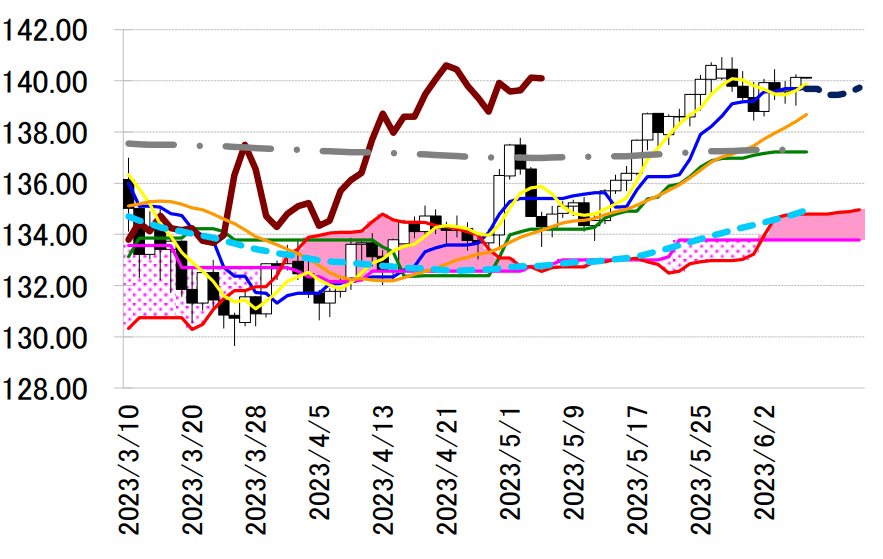 下影陽線引け。一目均衡表・転換線 139.69 円を下抜け、139 円割れを試すように下値を探る展開が先行した。しかし安値を 139.03 円にとどめ大台割れを回避。140 円を回復して引ける反発となった。転換線は週をまたぎ現水準から 139.45 円へ低下する見込み。同線の下押し予想が示唆するような不安定に振れる推移となった。しかし底堅さ維持が寄与し、転換線は来週 13 日にも反転切り上がりとなる公算。上下に多少振れつつも相場が底堅さを保つ兆しの 1 つと考えていいだろう。