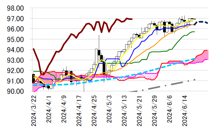 いない。下支えとなる一目均衡表・転換線が明日96.67 円へ