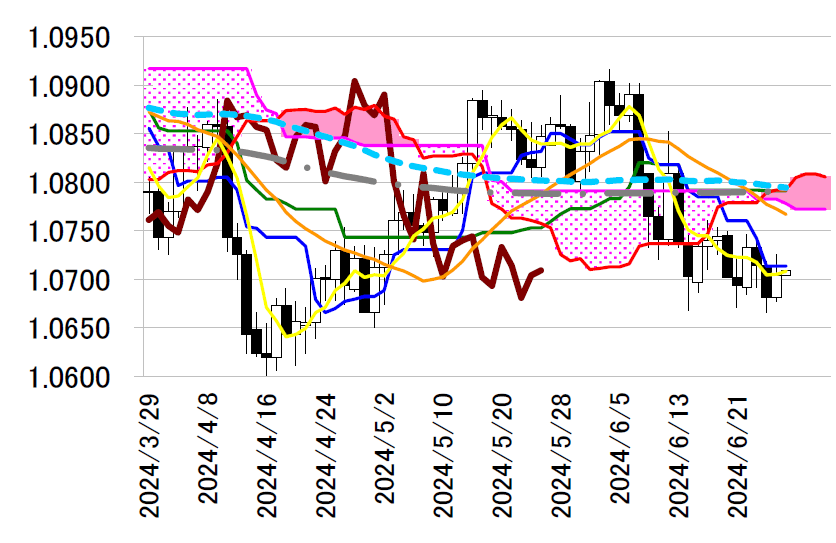 ただ、米連邦準備理事会(FRB)がインフレ指標として重視する5月個人消費支出(PCE)物価指数の発 表を明日28日に控えて、買いの勢いは長続きしなかった。フランス下院選の初回投票日が近づく中、欧 州の政治情勢を巡る不透明感も意識されて1.0700ドル付近まで下押しする場面があった。