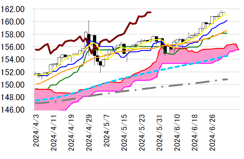 陽線引け。161 円を挟み暫く上下していたが、6 月28 日高