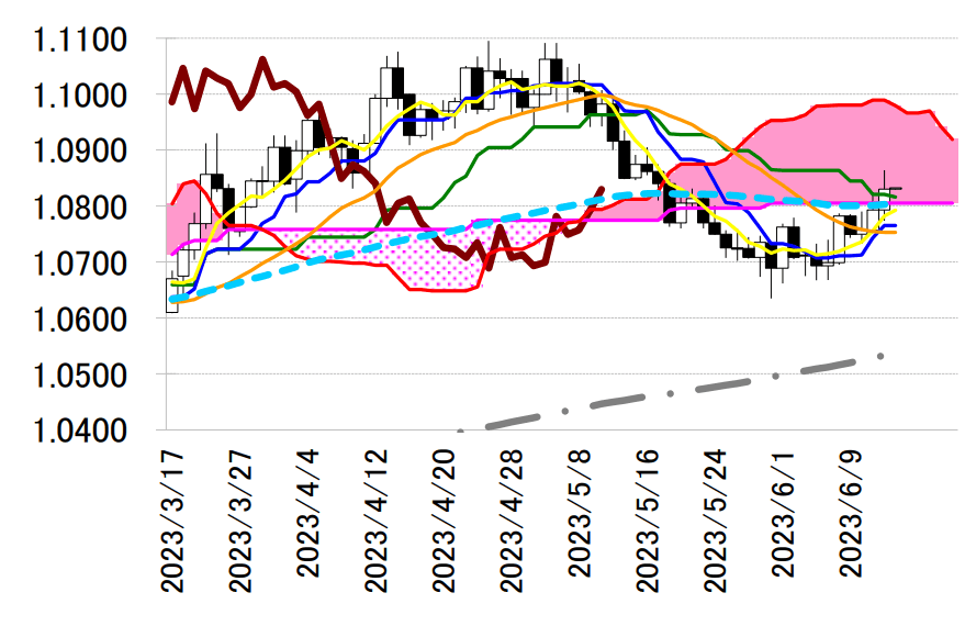 ユーロドルは 3 日続伸。終値は 1.0830 ドルと前営業日 NY 終値(1.0793 ドル)と比べて 0.0037 ドル程 度のユーロ高水準だった。欧州中央銀行(ECB)の利上げ継続を見込んだユーロ買いが先行したあとは、 米インフレ指標の下振れを受けて全般ドル売りが進行。前日の高値 1.0824 ドルを上抜けて一時 1.0864 ドルと 5 月 17 日以来の高値を付けた。ただ、FOMC の結果を受けて米利上げが長期化するとの観測が高ま るとドルを買い戻す動きが優勢となり、一時 1.0802 ドル付近まで伸び悩んだ。