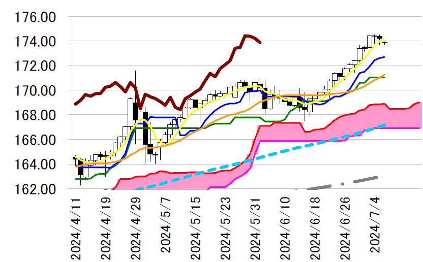 前後の攻防となっている。週明け、5 日線は174.07 円前後へ