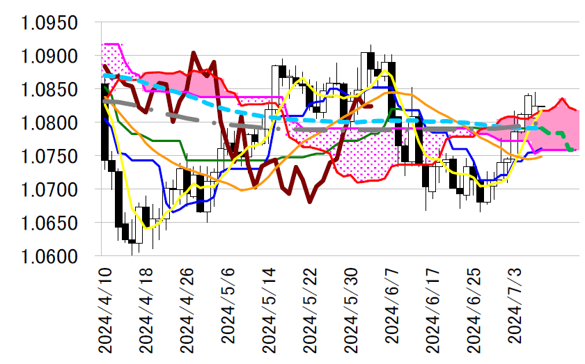 れも見せている。本日1.0818 ドルに位置する雲の上限付近