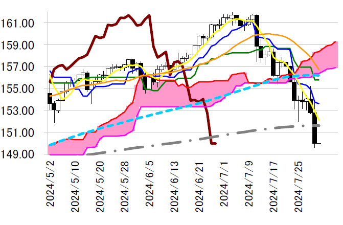 FOMCはこの日、市場予想通り政策金利を5.25-5.50%で据え置くことを決めたと発表。声明では「イ ンフレ目標に向けてのさらなる進展がみられた」「経済の見通しは不確実で、委員会は二つの責務の両サ イドに対するリスクを大いに注視している」との見解が示された。また、パウエル米連邦準備理事会(FRB) 議長は会見で「FOMCは利下げに近づいているという感触を得ている」「9月FOMCで利下げが選択肢になる 可能性ある」と述べ、9月利下げの可能性に言及した。市場では米金利の低下とドル売りが優勢となり、 4時30分過ぎに一時149.61円と3月19日以来約4カ月ぶりの安値を付けた。
