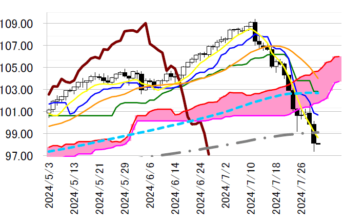 大陰線引け。転換線は基準線を下回り、遅行スパンは実線