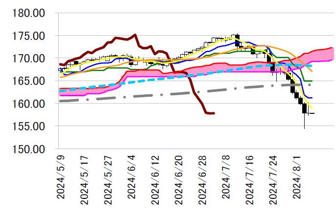 今回のドル円の売りトレンドを決定づけたのが、7月31日の日銀政策決定会合での政策金利引き上げ と国債買い入れの減額、及び植田日銀総裁のタカ派発言がきっかけだった。そして、その後は米雇用統計 の悪化、株式市場の暴落などもあり、更にドル売り圧力が高まった。クロス円の値動きを見ても分かるよ うにドル売りトレンドだけではなく、円買いトレンドが強い。この流れが変わらないとする要因は複数あ るが、市場がドルロングを切れていない点、本邦の想定為替レートに近づいている点、日米中央銀行の方 向性の違いなどの3点があげられる。