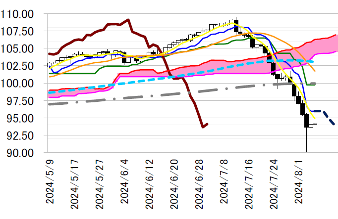 一目均衡表・転換線95.97 円の動向も下向きの流れ継続を示