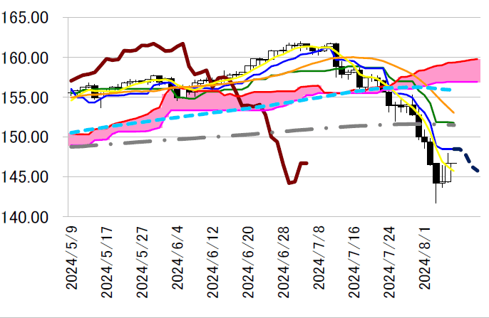 ドル円の支えとしては、昨日の内田副総裁のハト派発言のほか、皮肉なことに中銀の信頼性の欠如も円 安要因になりそうだ。もともと7月の利上げは政治的な圧力が主要因という声もある中で、昨日は内田副 総裁だけではなく、井藤金融庁長官が日本テレビとのインタビューで投資について「長期の目線」で対応 と述べるなど、株安の火消しに走っている。今回の内田副総裁の発言も、植田総裁が株価の乱高下につい て閉会中審査の出席を求められていることで、「日銀サイドも政府の意向を組んで株安を阻止しようとし ている」とのうわさもあるほどだ。