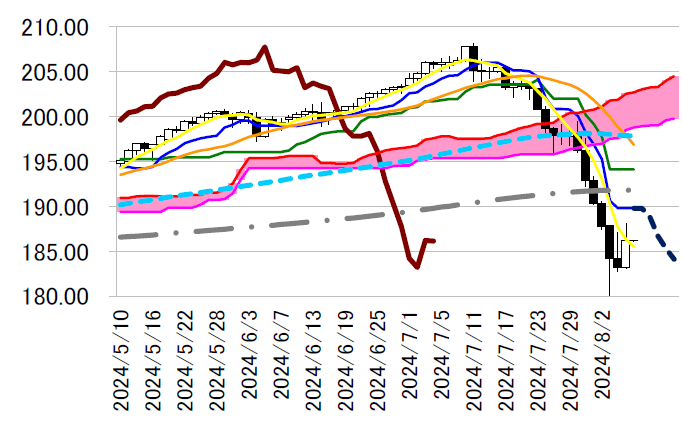 5 日移動平均線186.32 円を下回る水準へ押し戻されたが、本