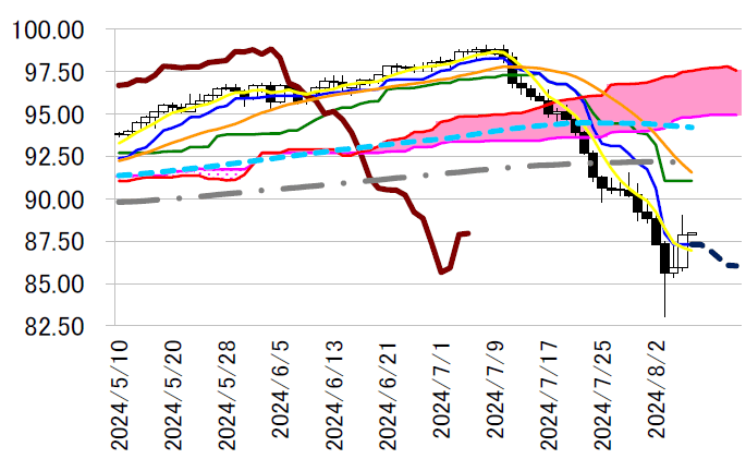 サポート1 86.73(8/5-7上昇幅の38.2%押し)