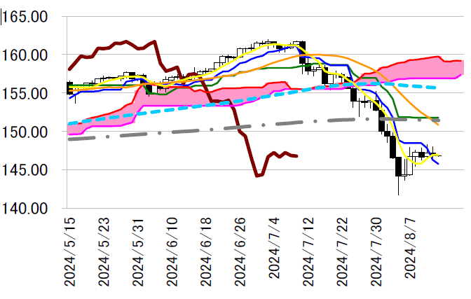 昨日の大幅上昇で日経平均株価は前週の下げをすべて回復したが、ドル円が同様に回復するというのは 異なる。円が買われやすいのは日銀の金融政策だけではなく、上述のように米インフレの低下やリスク回 避の動き、また対円だけではなく対アジア通貨でのドル売りが進んでいることも一因。昨日時点で今月に 入り3%超上昇しているマレーシア・リンギを筆頭に、インドネシア・ルピアやフィリピン・ペソも2.5% 程度対ドルで強含んでいる。本日も米金利の低下で株価の上昇が期待されているものの、ドル円が昨日の ように一方的に上昇することを期待するのは難しいだろう。