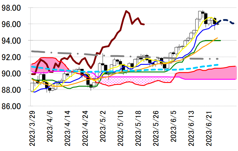 目均衡表・転換線 95.83 円を上回る水準へ戻して週引けでき