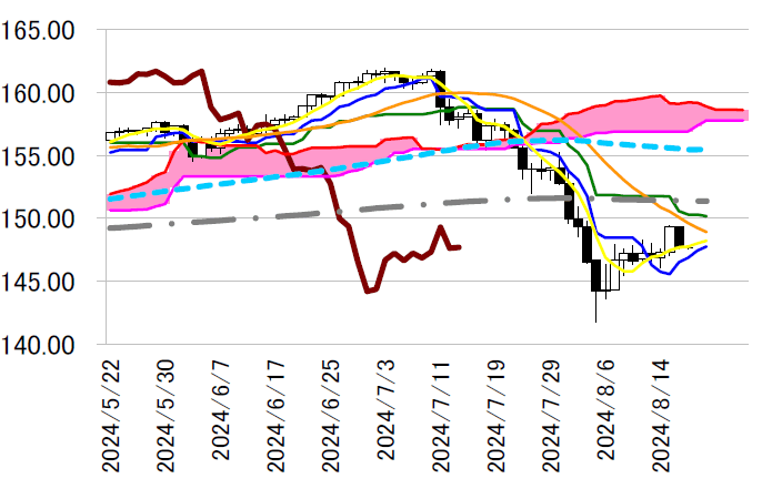 ドル円は、7月31日の植田日銀総裁による金利の壁0.50%以上の追加利上げ示唆とパウエルFRB議長 の9月FOMCでの利下げ開始示唆を受けて、下げトレンドに拍車がかかった。今週末の23日に植田日銀総 裁は、衆議院財務金融委員会での閉会中審査で利上げに関する意見聴取が予定されている。パウエルFRB 議長はジャクソンホール会合で講演が予定されていることで、両者の見解が7月31日と同じなのか否か を見極めることになる。