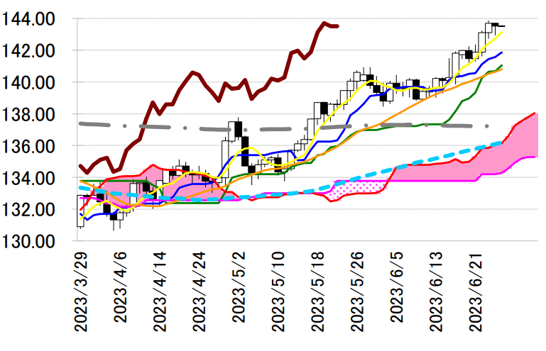 本日のドル円も 143 円台でもみ合いとなるか。先週トルコ中銀が利上げしたことで、日本と中国のみが 金融引き締めに動かず、円と元が売られやすい状況が続いている。もっとも、昨日公表された 6 月 15-16 日に行われた「日銀金融政策決定会合における主な意見」では、「基調的なインフレ率を示す各種指標も、 軒並み 2%を超えてきている。消費者物価(除く生鮮食品)の前年比は、年度半ばにかけ低下していくも のの、2%を下回らない可能性が高い」と明言している。これは、植田日銀総裁が 6 月 16 日の日銀政策決 定会合後の記者会見で発言した「持続的・安定的な 2%にはまだ達していない」と整合性が無いと言える。 「イールドカーブコントロール(YCC)はある程度のサプライズが発生することはやむを得ない」とも発 言している植田氏のことなので、今後のサプライズには要警戒となりそうだ。