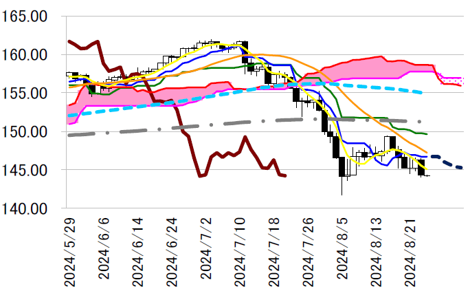本日のドル円は上値が重いか。先週末のカンザスシティー連銀主催の年次シンポジウム(通称・ジャク ソンホール会合)でパウエル米連邦準備理事会(FRB)議長が「政策を調整する時が来た」と述べ、改め て米金融政策が転換点を迎えたことを示した。市場ではこれまでの50ベーシスポイントの利下げ予想に 傾くほどの過熱感はないが、冷静に今後の米金利低下を織り込んでいくことになるだろう。一方、同日に 植田日銀総裁は日銀の調整の姿勢は変わらないことも示した。