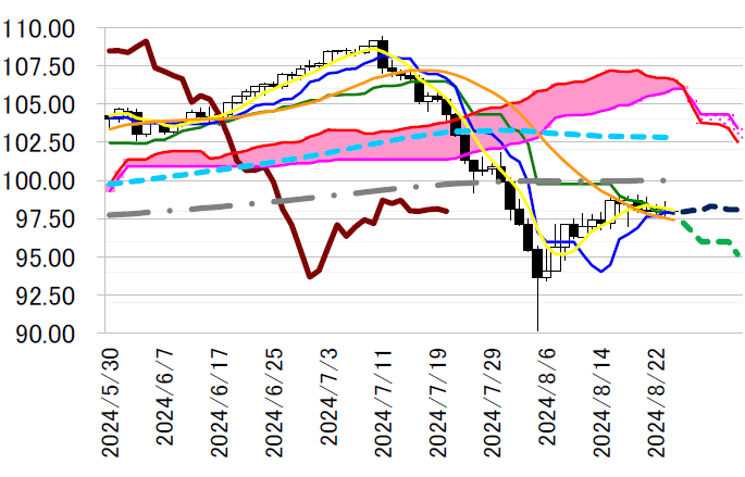 97.79 円に追随して下値を探るリスクが気になるところ。97