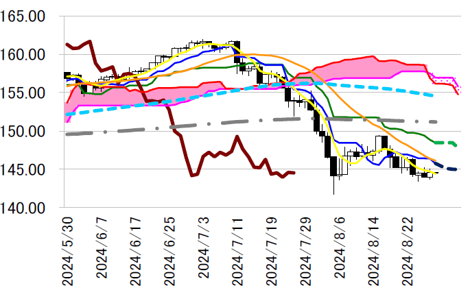 一目均衡表・転換線が昨日の146.40 円から145.75 円へ切り