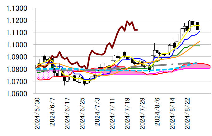 った。一目均衡表・転換線1.1087 ドルは維持したものの勢