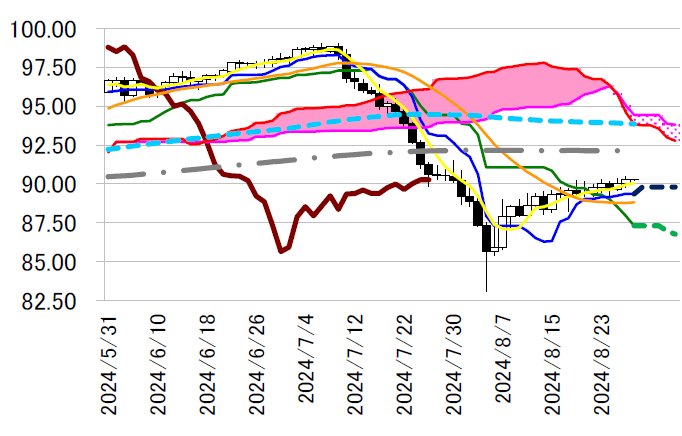 で上昇している。低下傾向の一目・基準線87.30 円を追う展