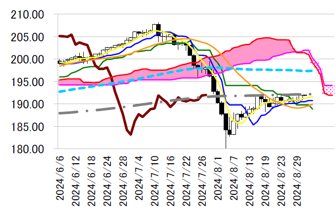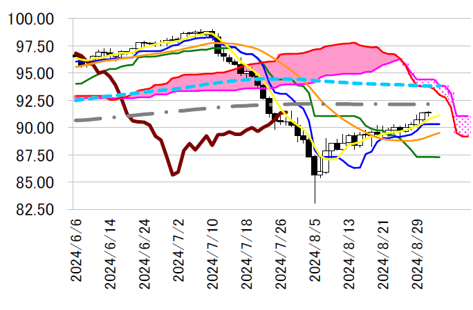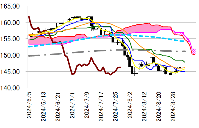 米国のインフレ率の鈍化傾向は続いているものの、6月と7月が前年比+2.5%で下げ渋ったため、9月 米連邦公開市場委員会(FOMC)での利下げ幅が0.50%ではなく、0.25%の可能性が高まったことが、米 長期金利の上昇、そしてドルの買い戻しに繋がったと思われる。
