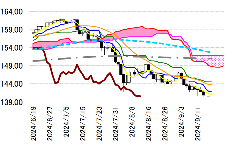 本日の東京外国為替市場のドル円は、本日からの米連邦公開市場委員会(FOMC)での0.50%の利下げ 確率の上昇や19-20日の日銀金融政策決定会合への警戒感などから上値が重い展開が予想される。 ドル円は、FOMCでの0.50%の利下げ確率が高まったことで、一時昨年7月以来の円高水準である139.58 円まで下落しており、中期的な上昇トレンドの起点だった127.23円(2023/1/16)までの全値押しの可能 性が高まりつつある。しかし、昨日の値動きは、日本や中国が休日での閑散取引の中での「往って来い」 となっており、FOMCでの利下げ幅や日銀金融政策決定会合での金融政策を見極める展開となる。 ドル円のテクニカル分析では、7月に付けた1986年12月以来の高値161.95円を頭とするヘッド・ア ンド・ショルダーが完成しつつあり、ネック・ライン140.25円付近を明確に下抜けた場合は、127.23円 までの下落の可能性が高まることになる。しかし、昨日の終値はネック・ラインの上だったことで、現状 では未完成となっている。