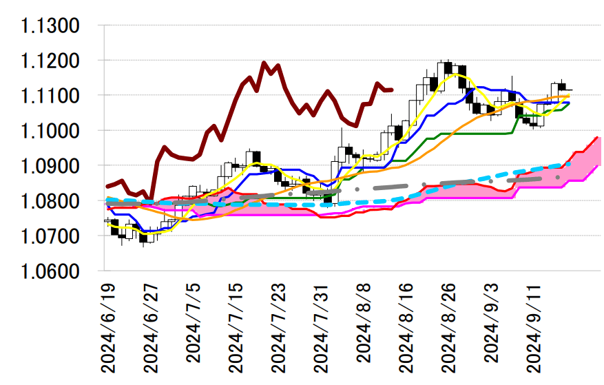 なお、シカゴ・マーカンタイル取引所(CME)グループがFF金利先物の動向に基づき算出する「フェド ウオッチ」によると、FOMCで0.25%の利下げを予想する確率は37%程度、0.50%の利下げを予想する確 率は63%程度となった。一方、エコノミストの間では0.25%の利下げ予想が大勢を占めている。 ユーロドルは反落。終値は1.1114ドルと前営業日NY終値(1.1133ドル)と比べて0.0019ドル程度の ユーロ安水準だった。日本時間夕刻に一時1.1146ドルと日通し高値を付けたものの、6日の高値1.1155 ドルが目先レジスタンスとして意識されると失速。米経済指標の上振れや米長期金利の上昇に伴うユー ロ売り・ドル買いが出て一時1.1111ドルと日通し安値を更新した。米重要イベントを控えたポジション 調整目的の売りも出た。