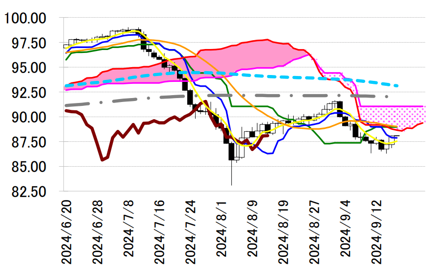 い。上値は雲の下限 88.67 円や基準線 88.97 円に要注目か。