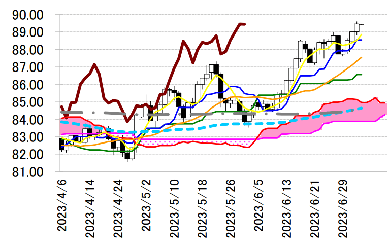 さらに、6 月の日銀金融政策決定会合の「主な意見」で、長短金利操作(イールドカーブ・コントロー ル、YCC)の早期修正論が取り上げられたことにで、7 月 27-28 日の日銀金融政策決定会合での YCC 許容 変動幅の拡大観測が台頭している。植田日銀総裁が明確に否定していないことも、円売りへの壁となって いるか。