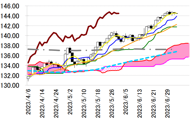 ドル円は、7 月 25-26 日の米連邦公開市場委員会(FOMC)での 0.25%の第 11 次の追加利上げ、そして、 年内もう 1 回の 0.25%の利上げ観測を背景に 144 円台で底堅い展開だ。しかしながら、145 円以上のドル 買い進めるには、米 10 年債利回りが 3.8%台で伸び悩んでいることや本邦通貨当局によるドル売り・円 買い介入への警戒感などが立ちはだかっている。