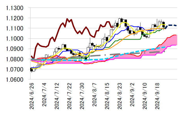 表・基準線1.1102 ドルと転換線1.1096 ドルも前後に推移す