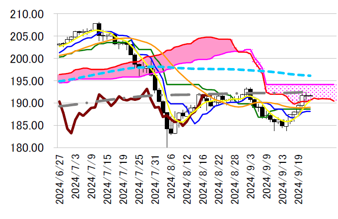 上昇傾向の一目均衡表・雲の下限190.61 円前後で下支えさ